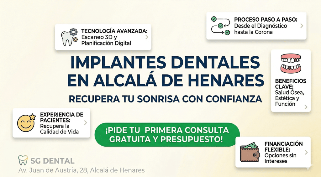 Perder un diente no es solo un problema estético. Afecta a cómo hablas, cómo masticas, y con el tiempo, a la estructura de tu mandíbula. Si estás buscando implantes dentales en Alcalá de Henares, en Clínica SG Dental llevamos más de 11 años ayudando a pacientes a recuperar su sonrisa — y su calidad de vida.