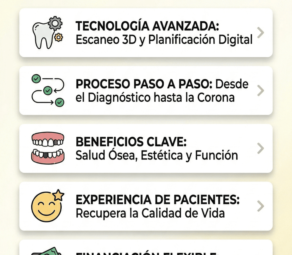 Esta es una de las preguntas que más nos hacen. La respuesta honesta: depende de cada caso. El precio varía según el número de implantes, el estado del hueso y si se necesita regeneración previa.